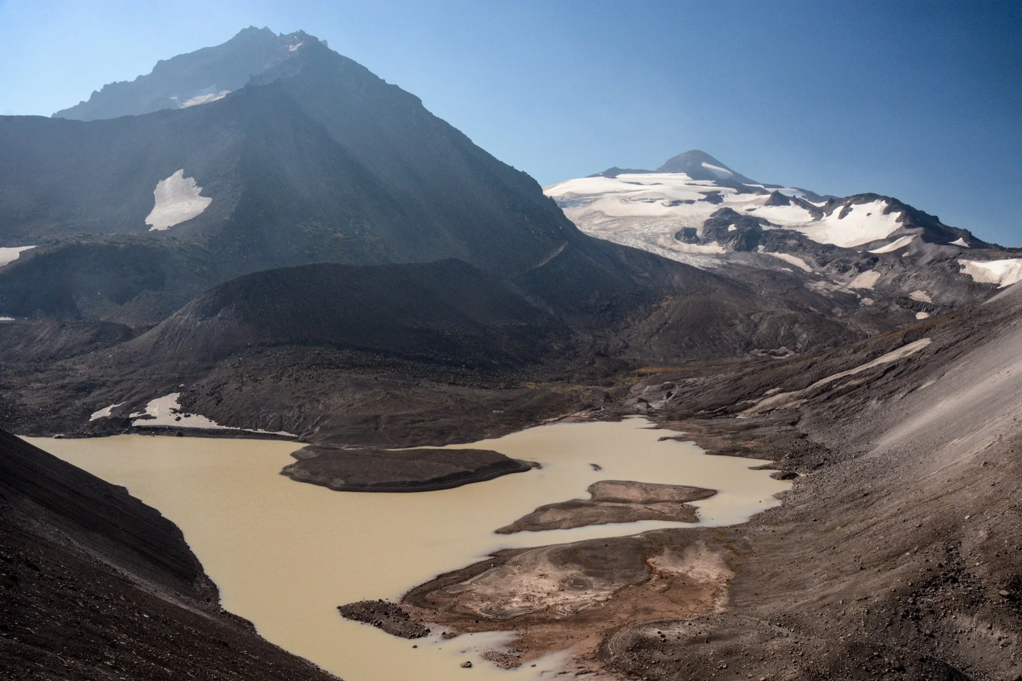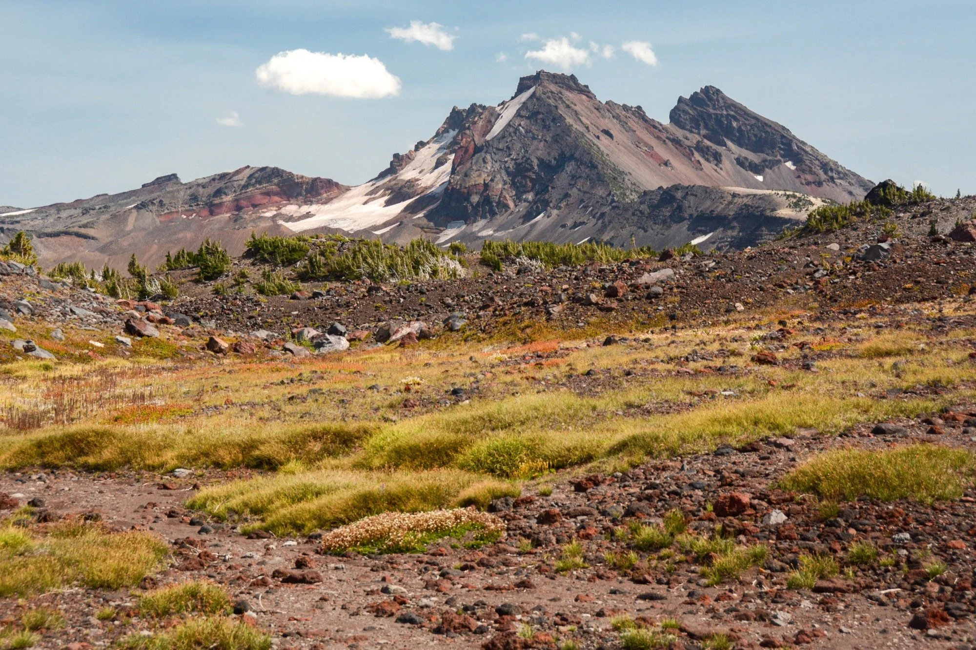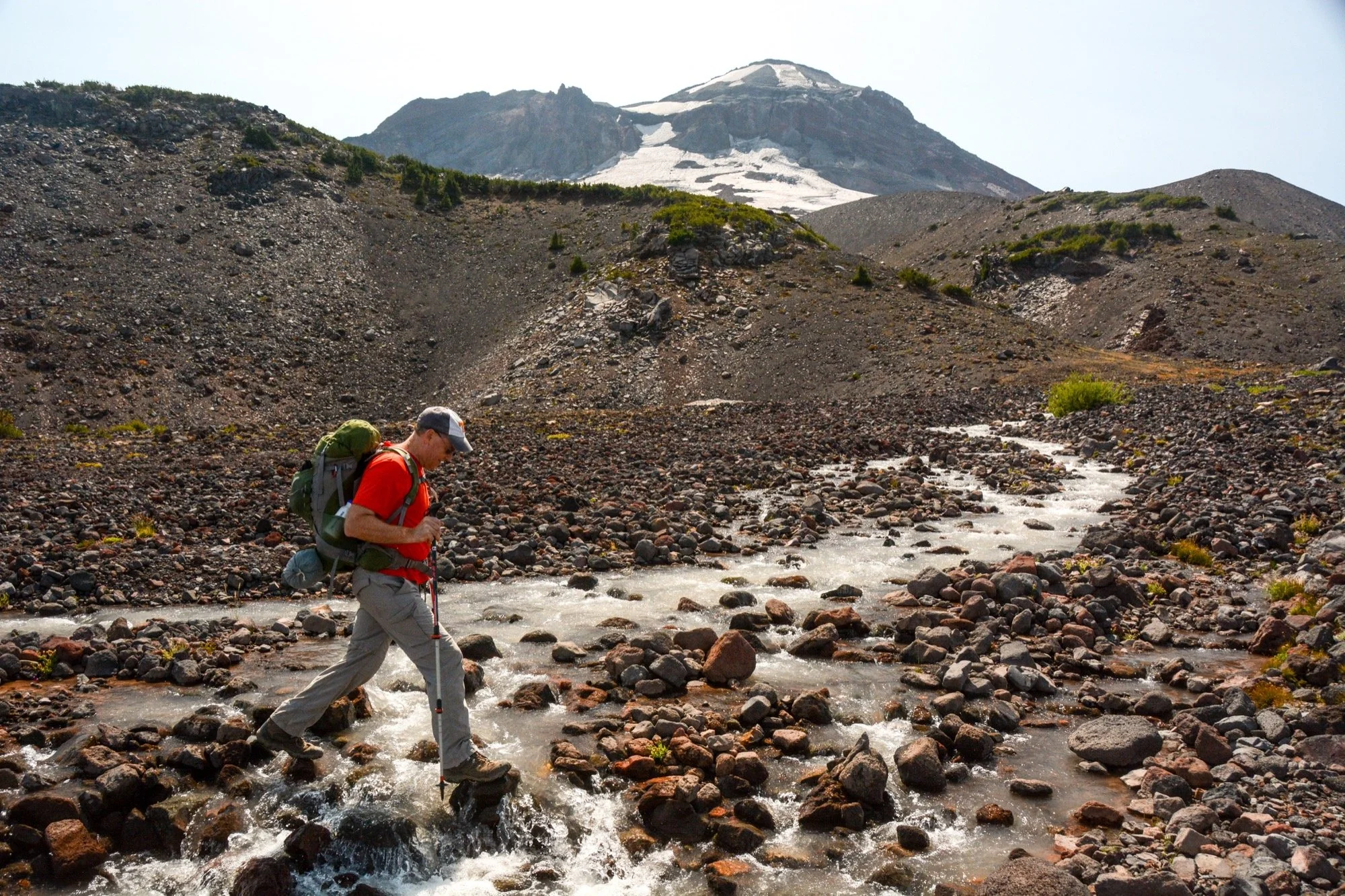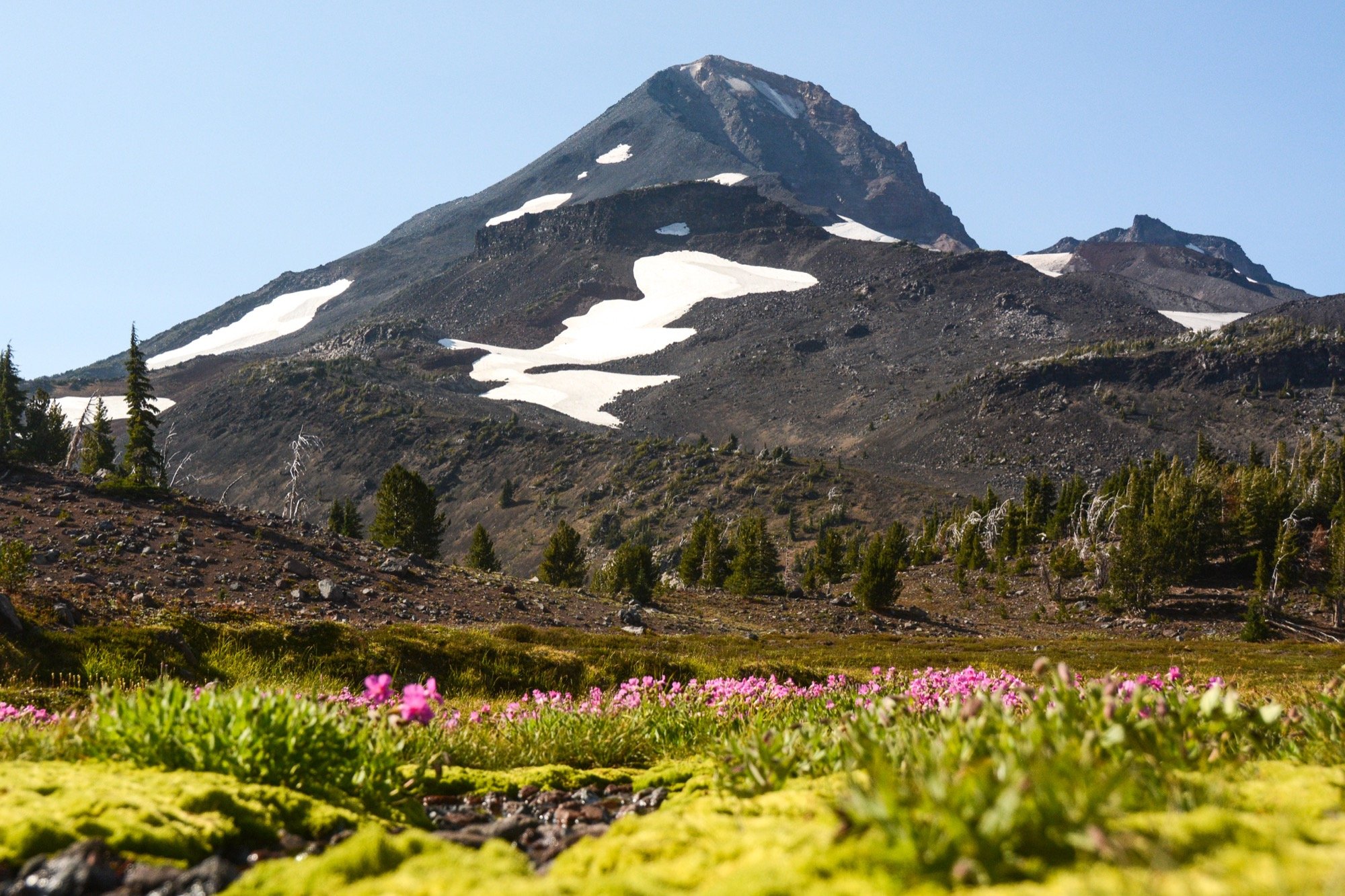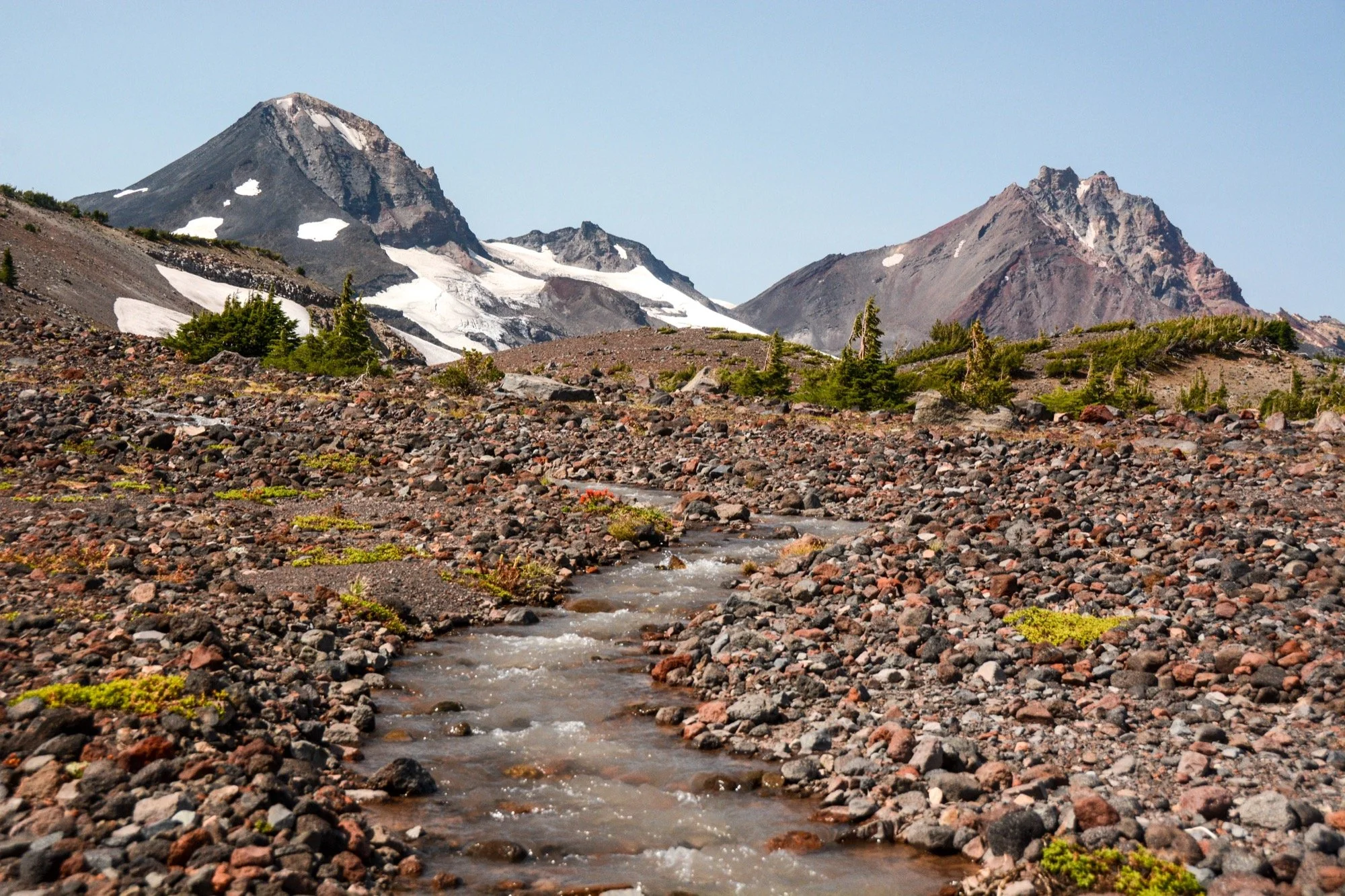At the low pass above the lakes, we left the trail for the rest of the day. Our route angled cross-country to the northwest, traversing the terrain beneath the Prouty Glacier. We crossed the streams that drain the ice, listening to hidden cobblestones rolling in the current as the water tries to tear the mountain down. The views of Broken Top were grand, and we had it all to ourselves.