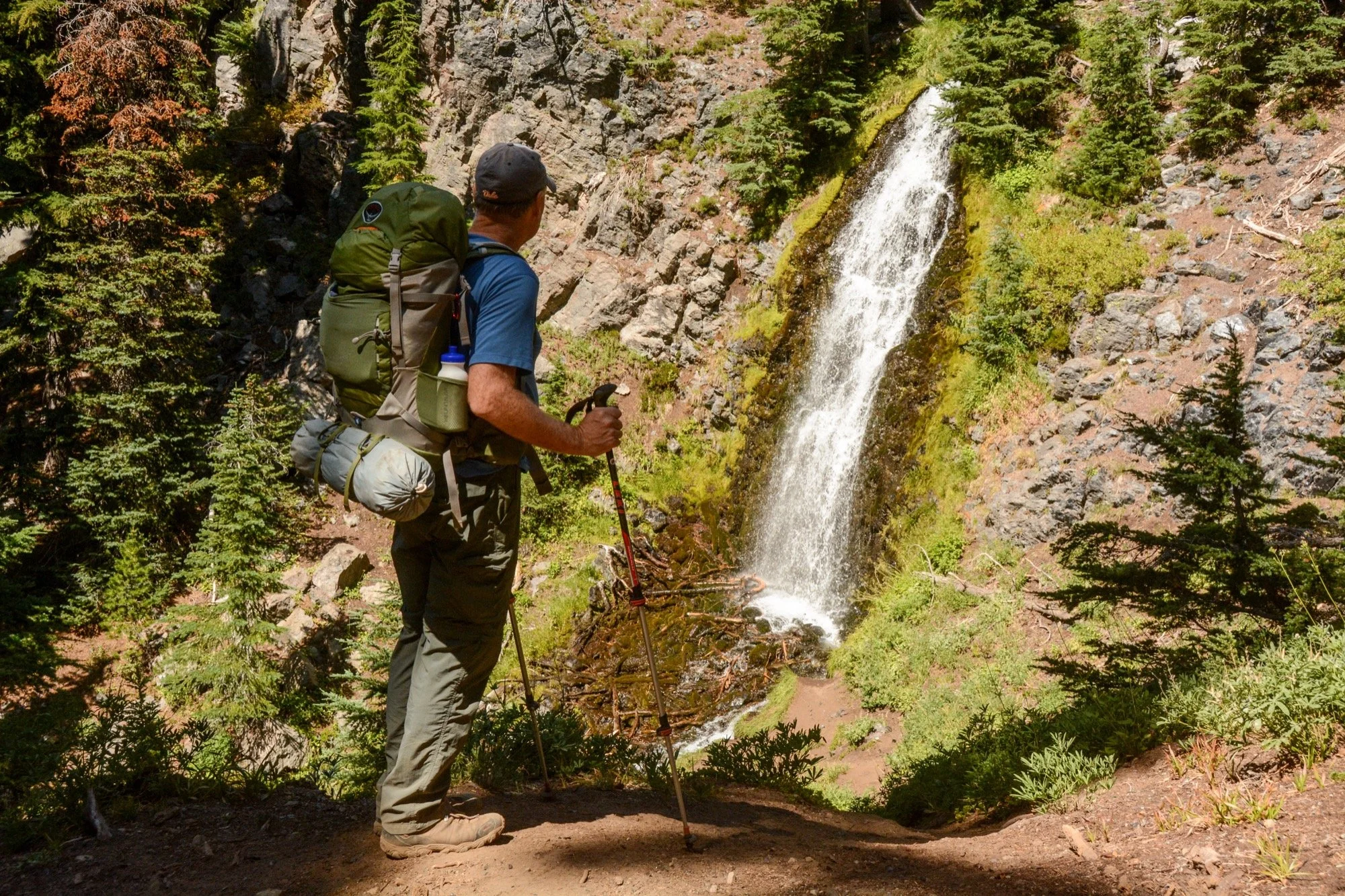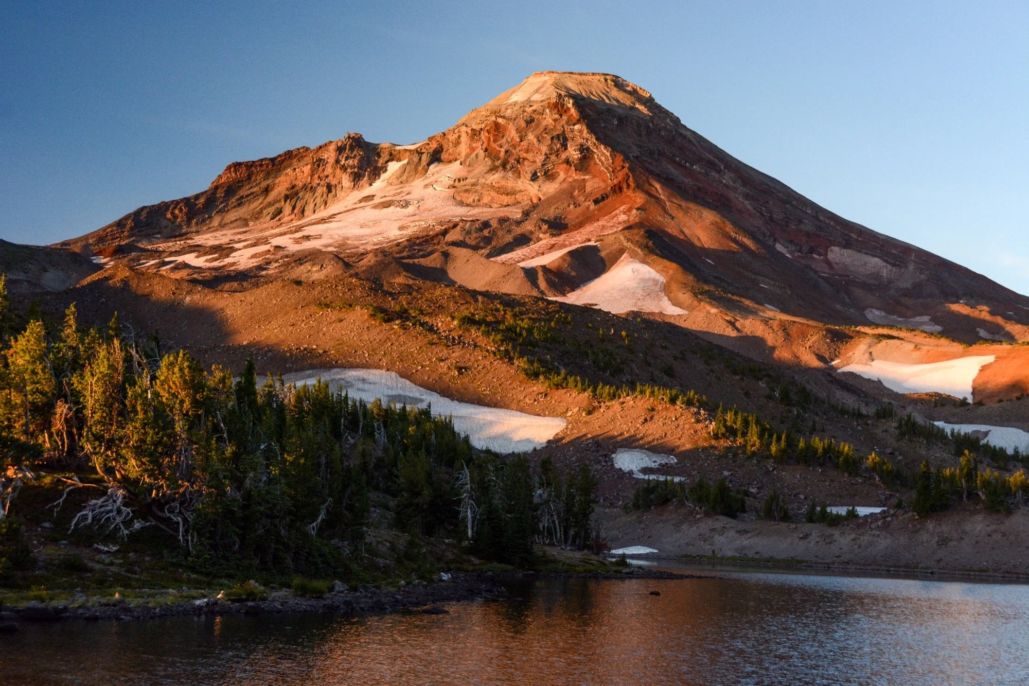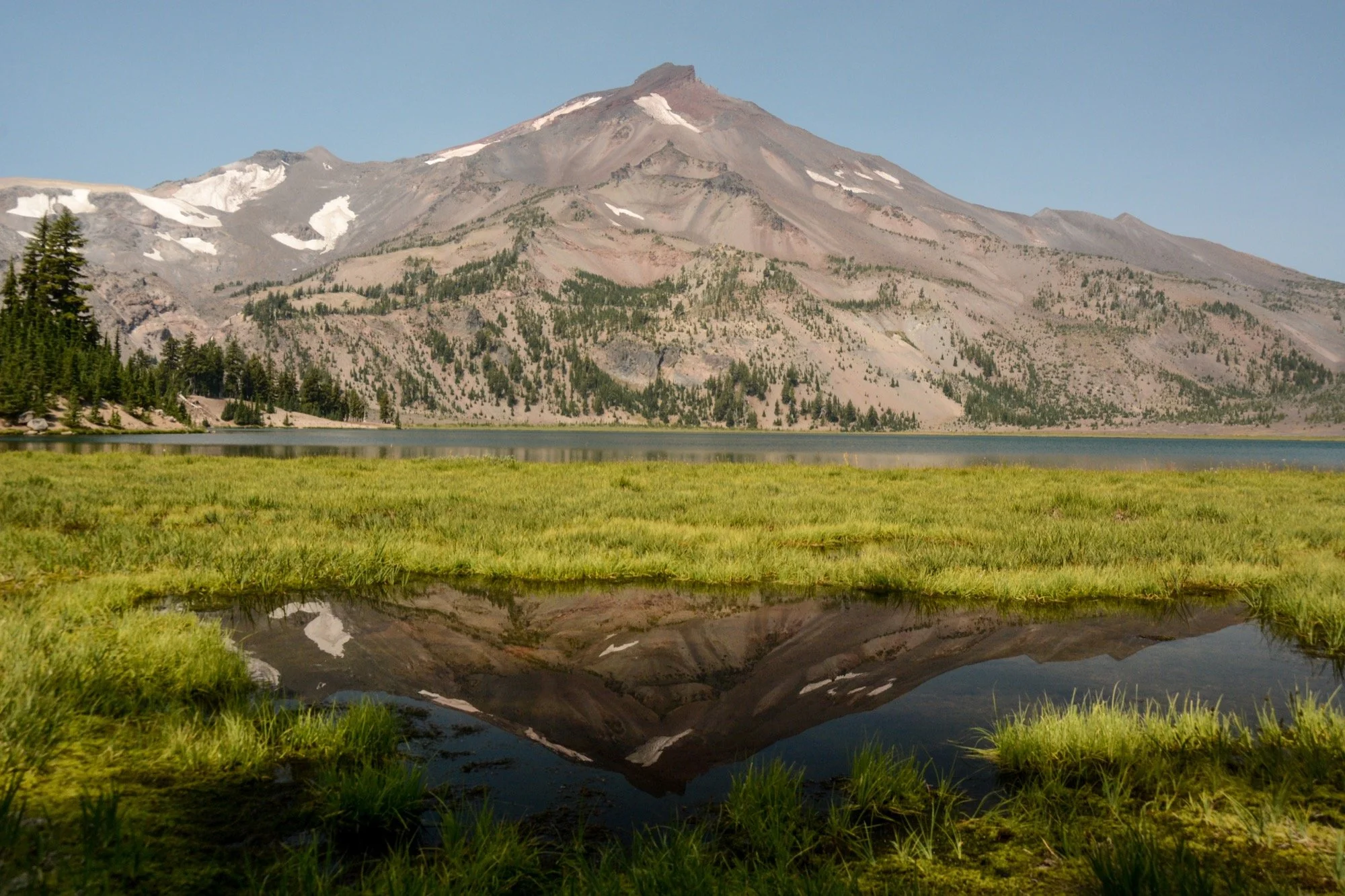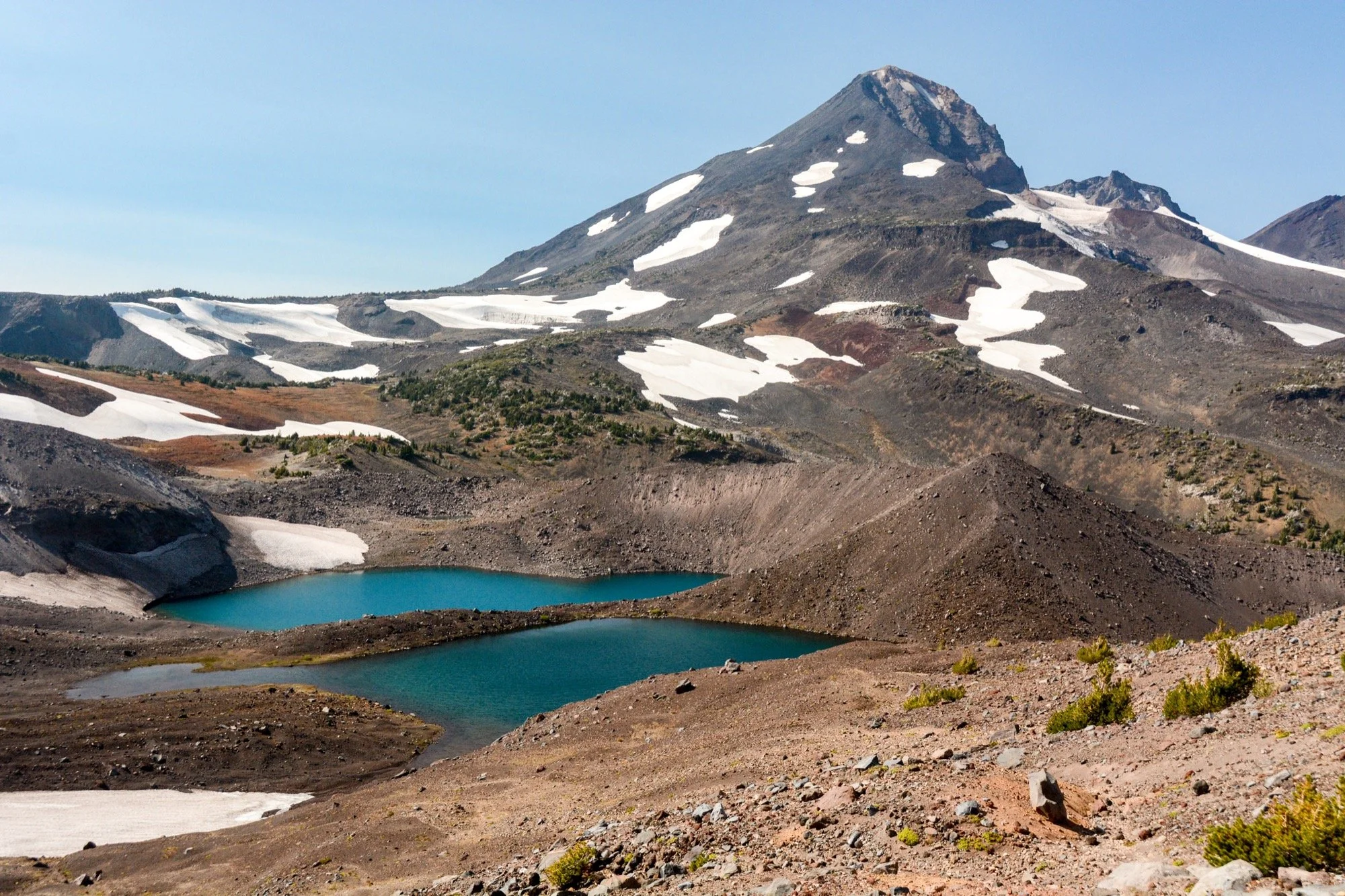 Clear skies on our way up Fall Creek, winding through the hemlocks and admiring the waterfalls that string out along the trail. We made it up to the Green Lakes for an early lunch in the shade. It’s such a different view of South Sister from down there, with no angle to the summit. Looks like a different mountain altogether.