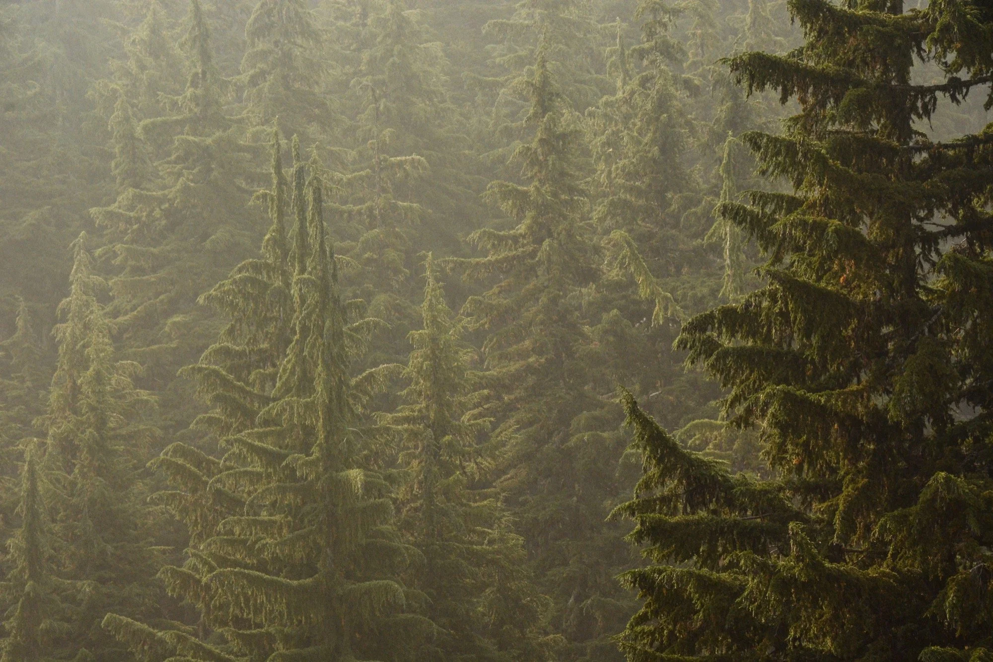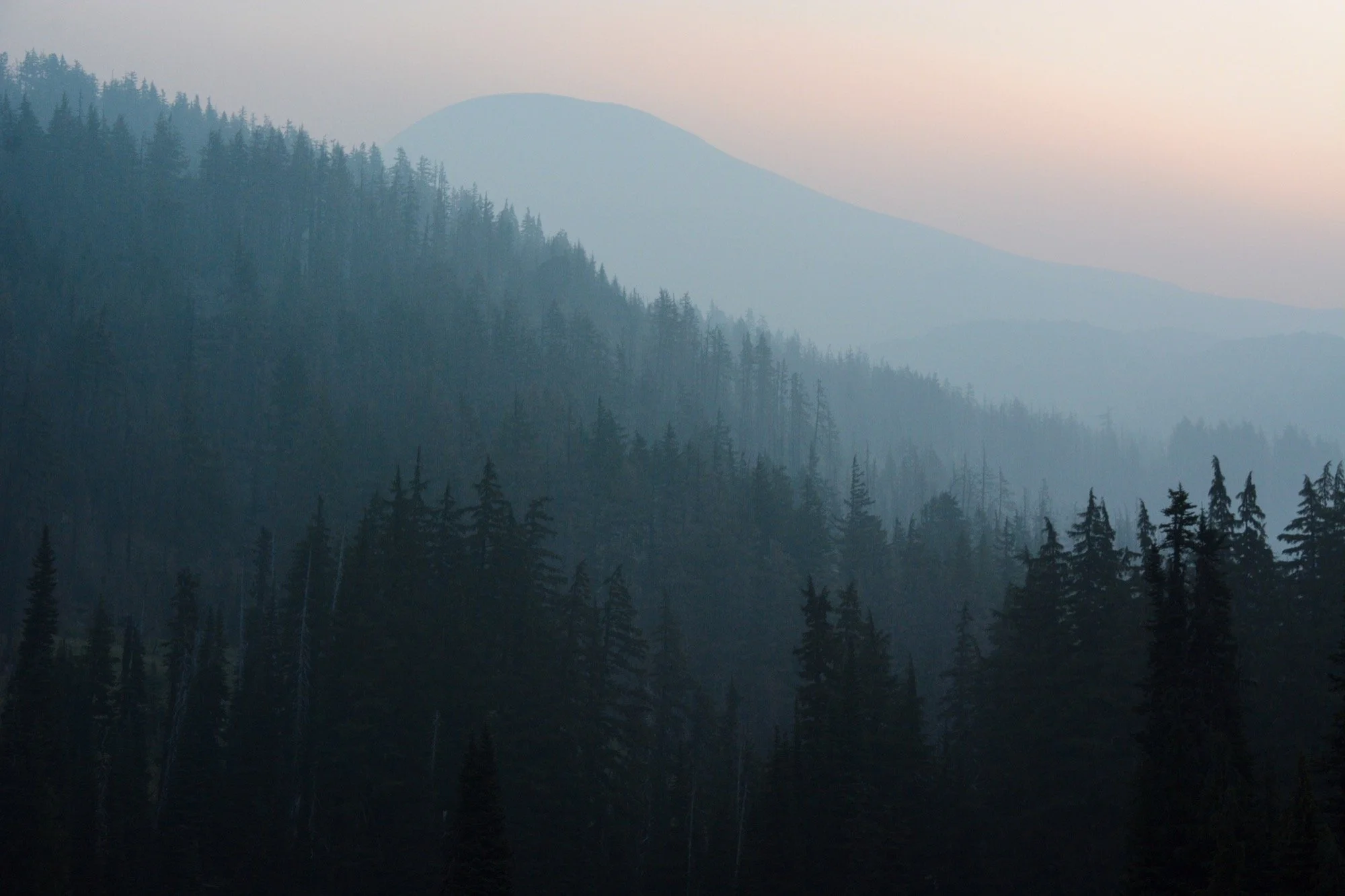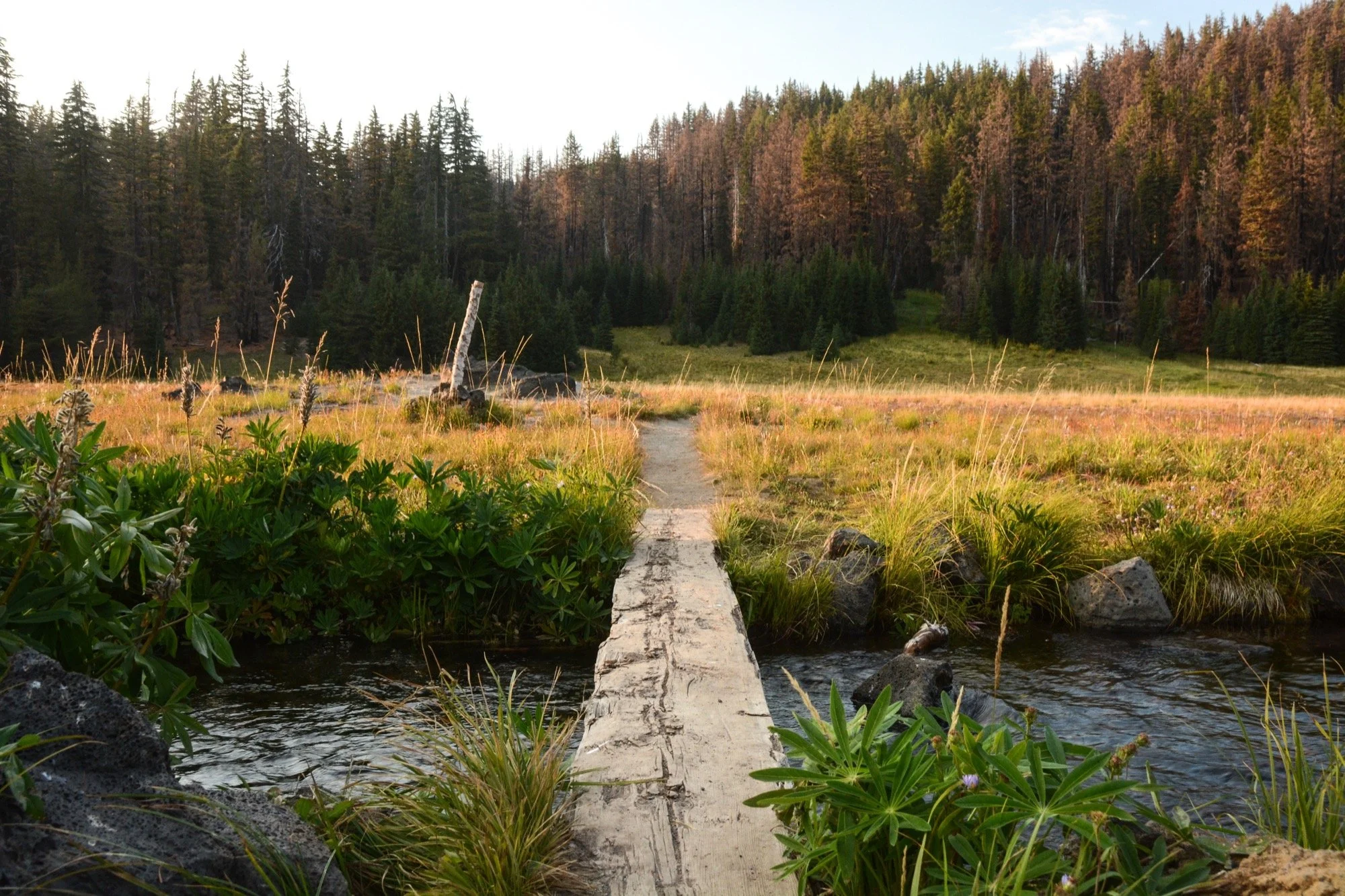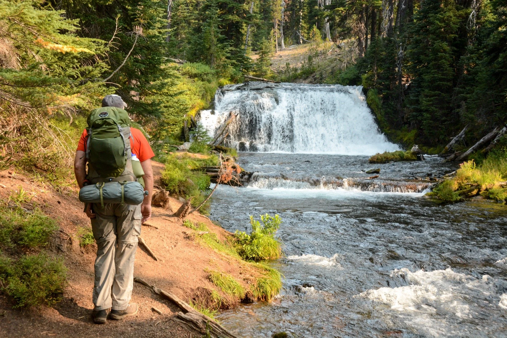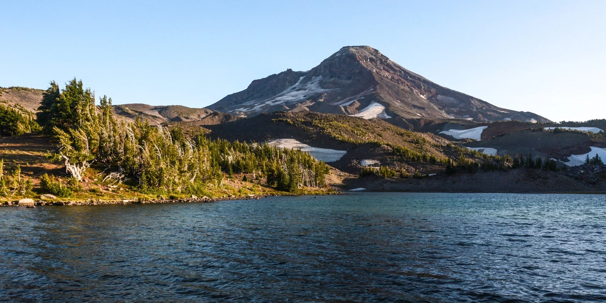 Clear skies on our way up Fall Creek, winding through the hemlocks and admiring the waterfalls that string out along the trail. We made it up to the Green Lakes for an early lunch in the shade. It’s such a different view of South Sister from down there, with no angle to the summit. Looks like a different mountain altogether.